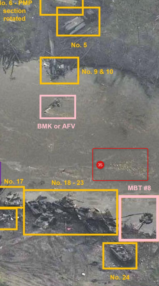К третьей категории (ложнопозитивные) я отнес все объекты, в отношении которых вывод об их уничтожении или повреждении сделать затруднительно или невозможно вовсе. Также к ним я отнес и все понтоны на берегу, т.к. сделать вывод об их повреждении по внешнему виду особенно трудно, если только машина с понтоном не уничтожена, как, например, №38.