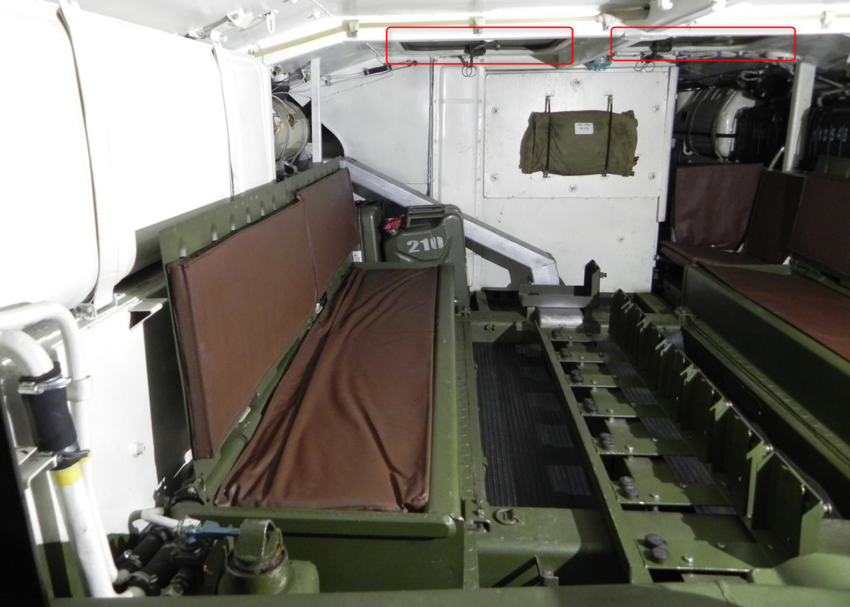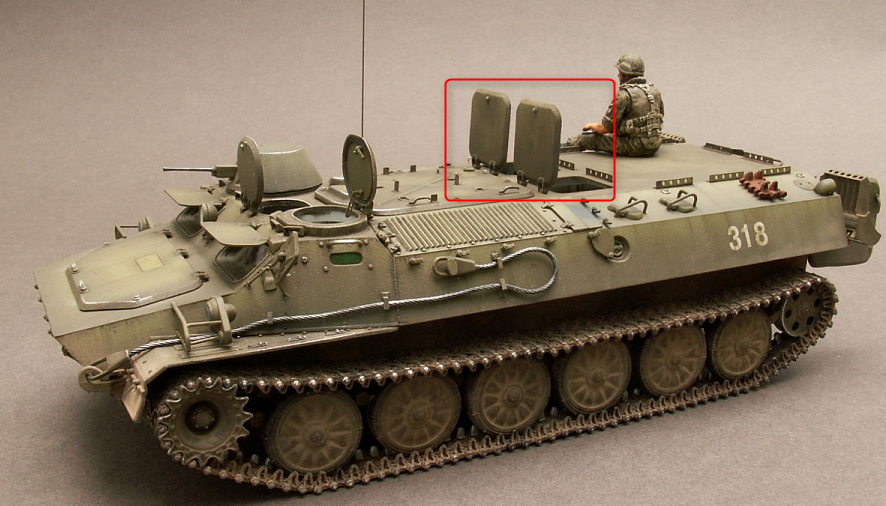 Я не знаю, где он там увидел "квадратную тень от башни БТР 4", но на фото видны две открытые крышки и проемы верхних люков мотолыжного десантного отделения.