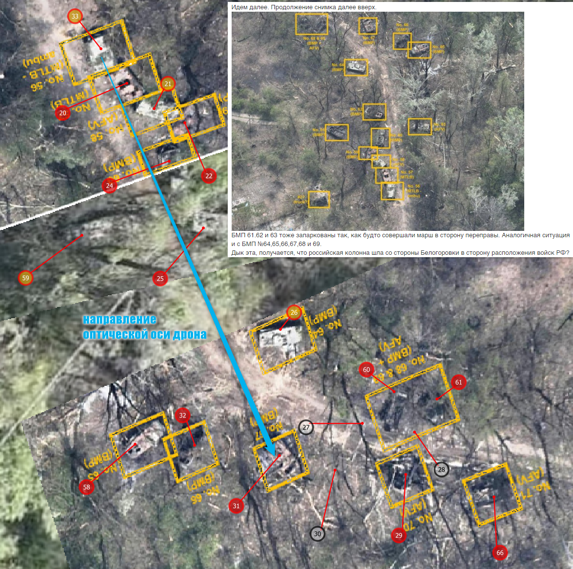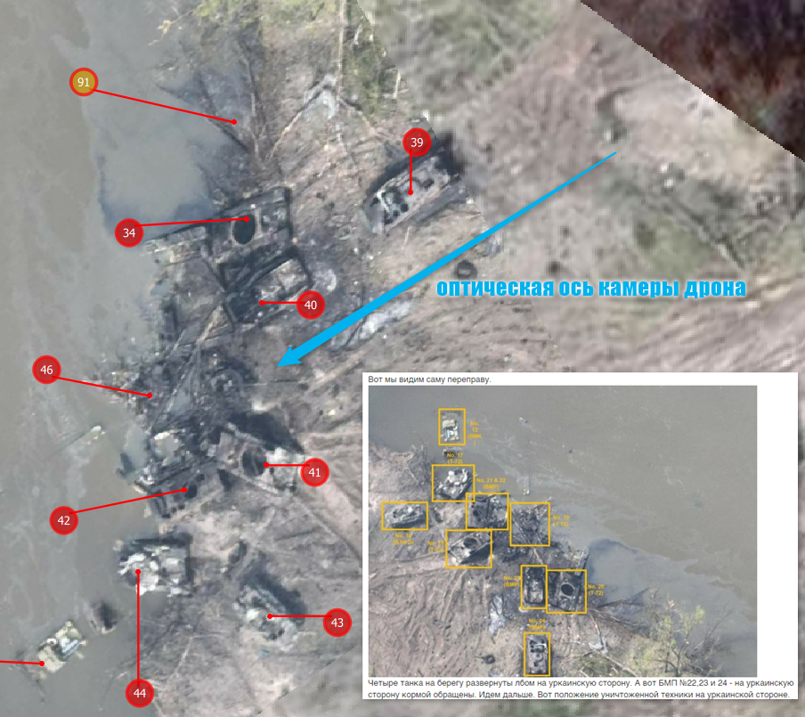 Следите за руками. Он берет первое фото (прибрежный кластер №№39-46), которое ориентировано примерно на запад-юго-запад почти перпендикулярно реке (т.е. на нем русский берег - "вверху", украинский берег - "внизу") и находит на украинском берегу три уничтоженных БМП, которые ориентированы носом "вверх", к реке: