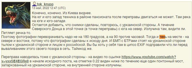 Считая, что и на всех последующих снимках река по-прежнему находится "вверху" снимка, как на первом, он "обнаруживает" что, оказывается, ВСЯ бронетехника смотрит носом к реке. Из чего и делается вывод, что это сожжена колонна украинской техники, двигавшаяся к реке.