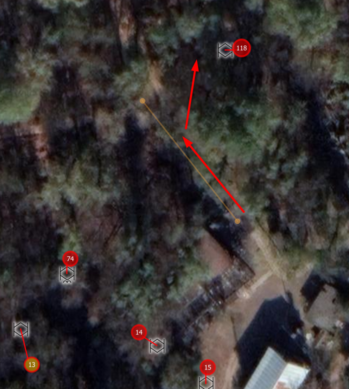 Но мне кажется, что они подворачивают правее; плюс, если бы они продолжали идти на северо-северо-восток (оранжевая линия) или подвернули бы левее, то через 40 метров (70-80 шагов) от колодца пересекли бы лесную дорогу, а ее как раз не видно.